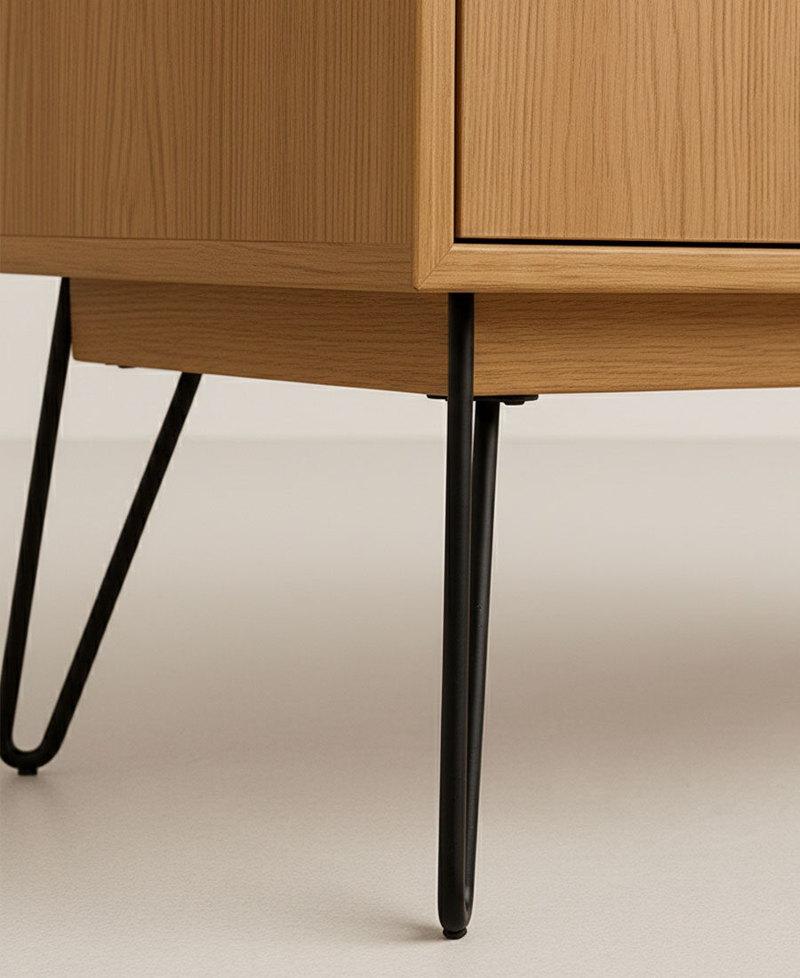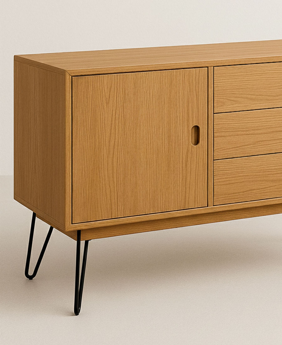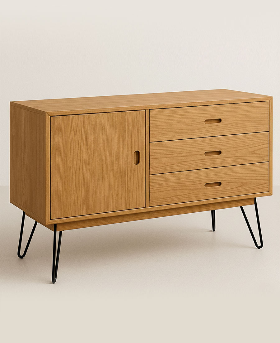 This contemporary sideboard pairs a warm wood finish with slim black metal legs for a clean, modern silhouette. Featuring three smooth-gliding drawers and a spacious cabinet compartment, it offers versatile storage for dining essentials, electronics, or everyday items. Its minimalist profile, integrated cut-out handles, and refined craftsmanship make it a functional yet stylish addition to living rooms, dining areas, or entryways.